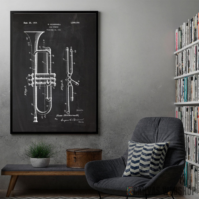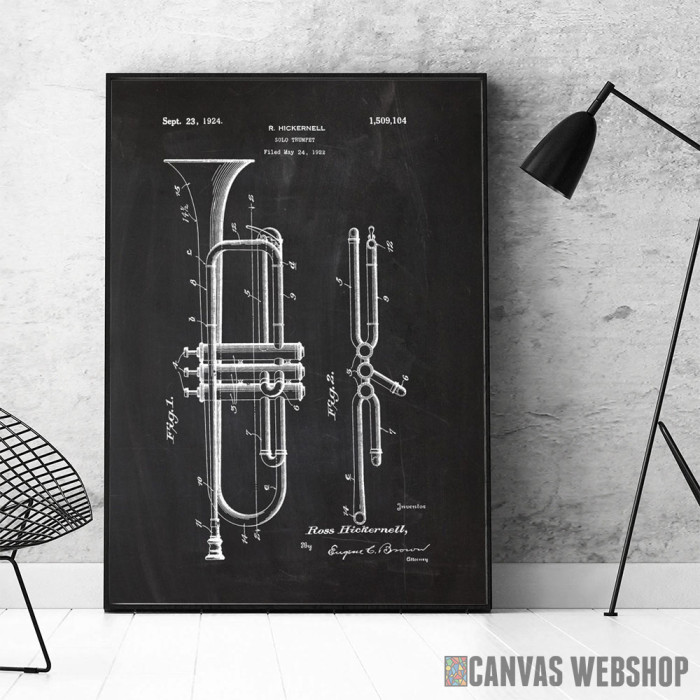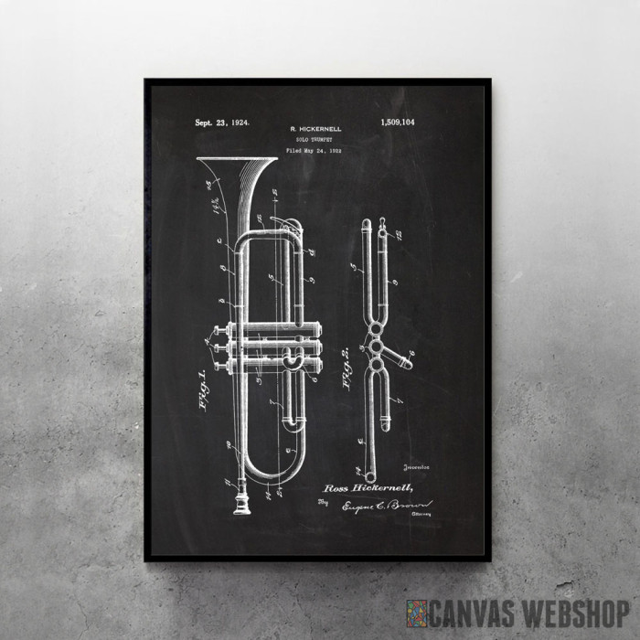 1922 Solo Trumpet - Patent Drawing je poster odštampan na papiru koji uokviruje elegantan drveni ram sa staklom. Uramljeni poster je dostupan u različitim dimenzijama.