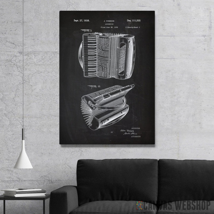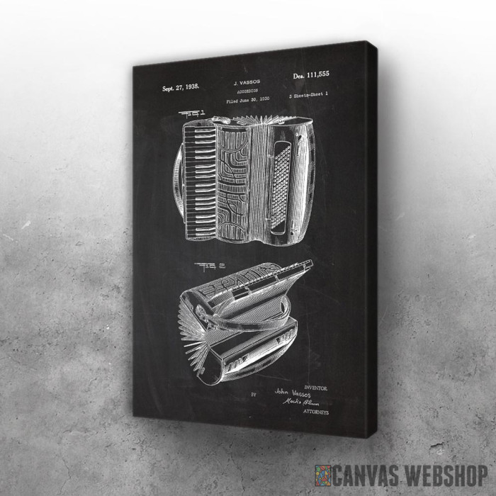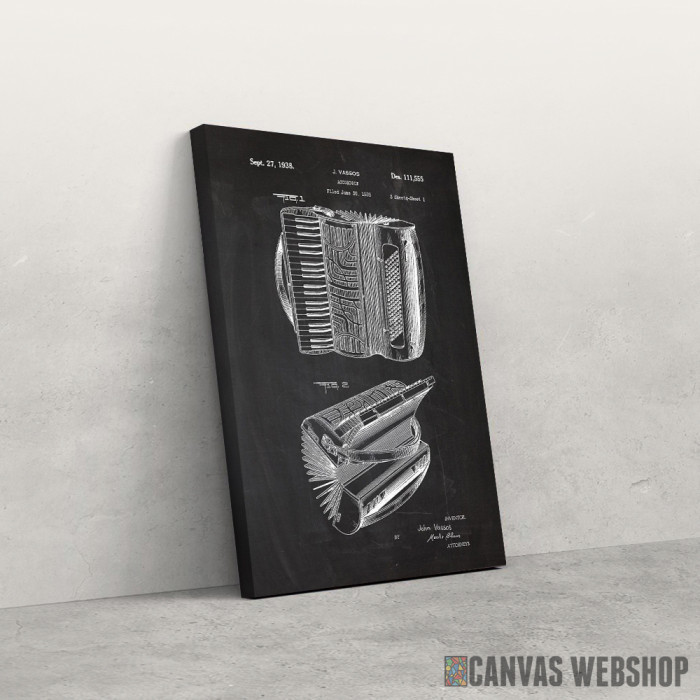 1938 Accordion - Patent Drawing je slika odštampana na kvalitetnom pamučnom platnu koje je zategnuto na ram od bukovog drveta. Slika 1938 Accordion - Patent Drawing je dostupna u različitim dimenzijama.