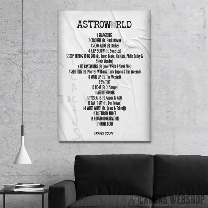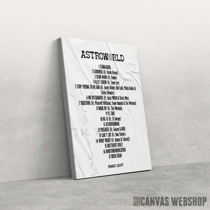 Astroworld album je slika odštampana na kvalitetnom pamučnom platnu koje je zategnuto na ram od bukovog drveta. Slika Astroworld album je dostupna u različitim dimenzijama.