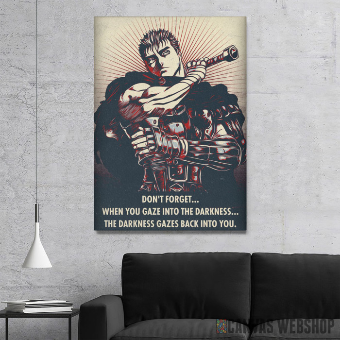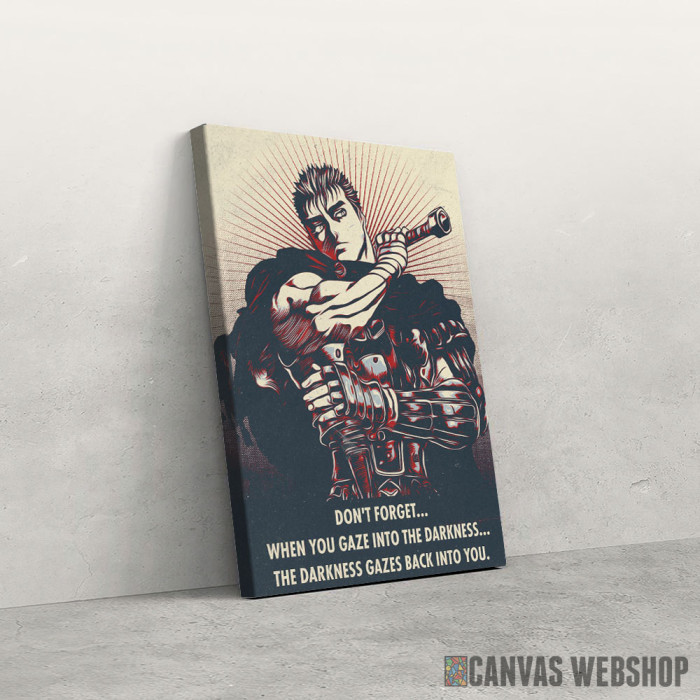 Berserk Guts citat je slika odštampana na kvalitetnom pamučnom platnu koje je zategnuto na ram od bukovog drveta. Slika Berserk Guts citat je dostupna u različitim dimenzijama.