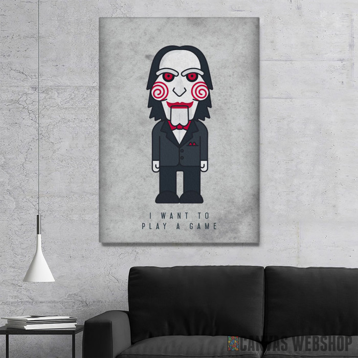 I want to play a game - Jigsaw je slika odštampana na kvalitetnom pamučnom platnu koje je zategnuto na ram od bukovog drveta. Slika I want to play a game - Jigsaw je dostupna u različitim dimenzijama.