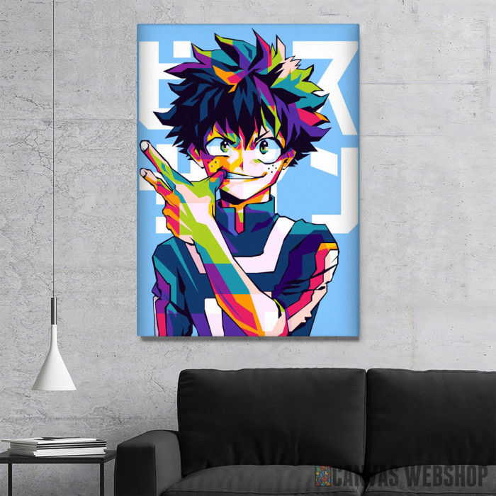 Izuku Midoriya Popart je slika odštampana na kvalitetnom pamučnom platnu koje je zategnuto na ram od bukovog drveta. Slika Izuku Midoriya Popart je dostupna u različitim dimenzijama.