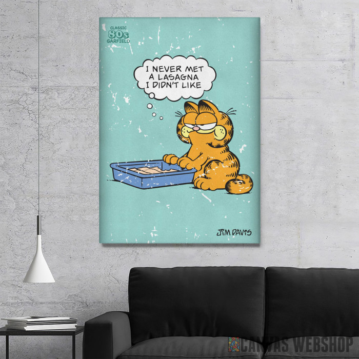 Garfield lasagna je slika odštampana na kvalitetnom pamučnom platnu koje je zategnuto na ram od bukovog drveta. Slika Garfield lasagna je dostupna u različitim dimenzijama.
