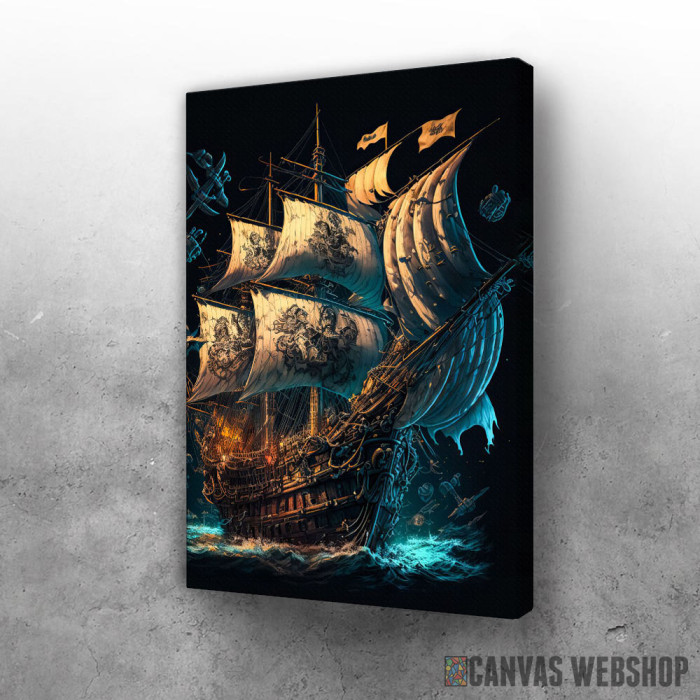 Piratski brod sa otvorenim jedrima je slika odštampana na kvalitetnom pamučnom platnu koje je zategnuto na ram od bukovog drveta. Slika Piratski brod sa otvorenim jedrima je dostupna u različitim dimenzijama.