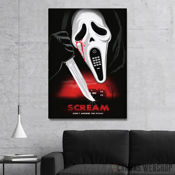 Scream film poster je slika odštampana na kvalitetnom pamučnom platnu koje je zategnuto na ram od bukovog drveta. Slika Scream film poster je dostupna u različitim dimenzijama.