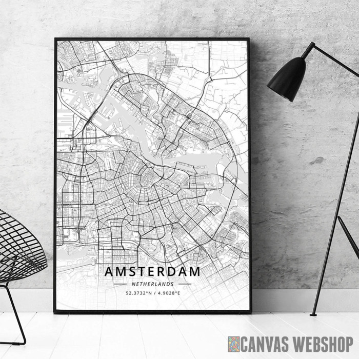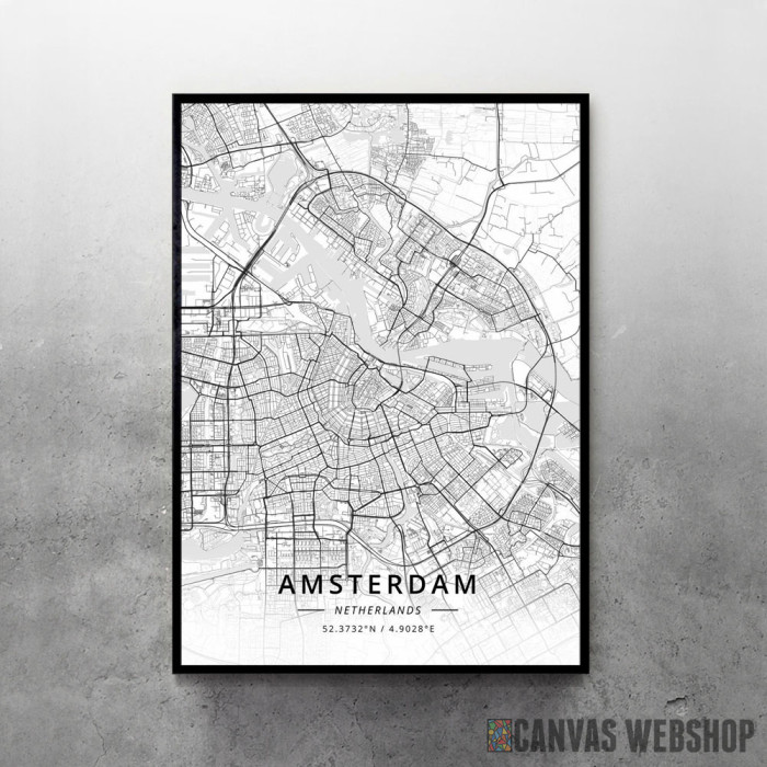 Amsterdam mapa - white je poster odštampan na papiru koji uokviruje elegantan drveni ram sa staklom. Uramljeni poster je dostupan u različitim dimenzijama.