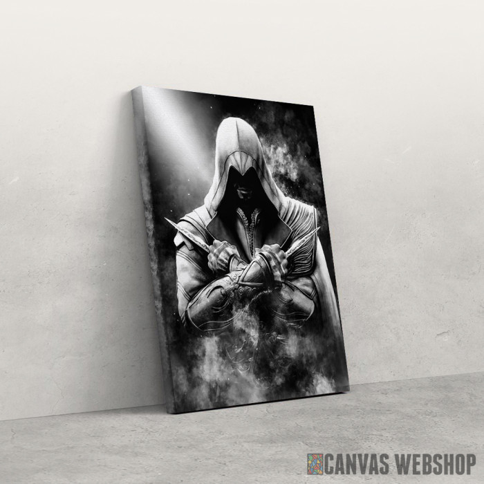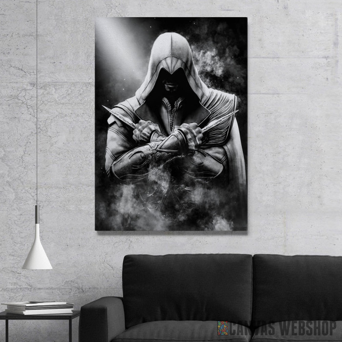 Assassins Creed crno belo je slika odštampana na kvalitetnom pamučnom platnu koje je zategnuto na ram od bukovog drveta. Slika Assassins Creed crno belo je dostupna u različitim dimenzijama.