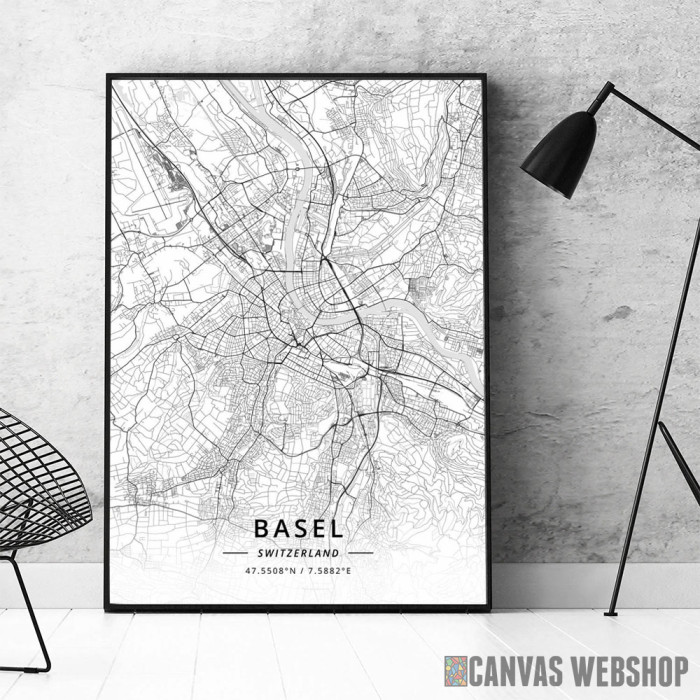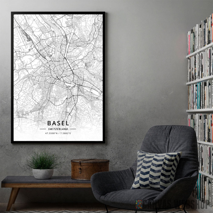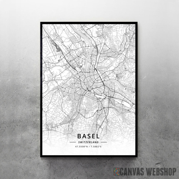 Bazel mapa - white je poster odštampan na papiru koji uokviruje elegantan drveni ram sa staklom. Uramljeni poster je dostupan u različitim dimenzijama.