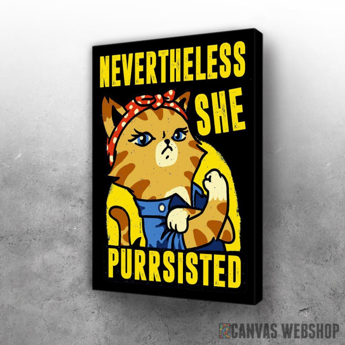 Cat She Purrsisted je slika odštampana na kvalitetnom pamučnom platnu koje je zategnuto na ram od bukovog drveta. Slika Cat She Purrsisted je dostupna u različitim dimenzijama.