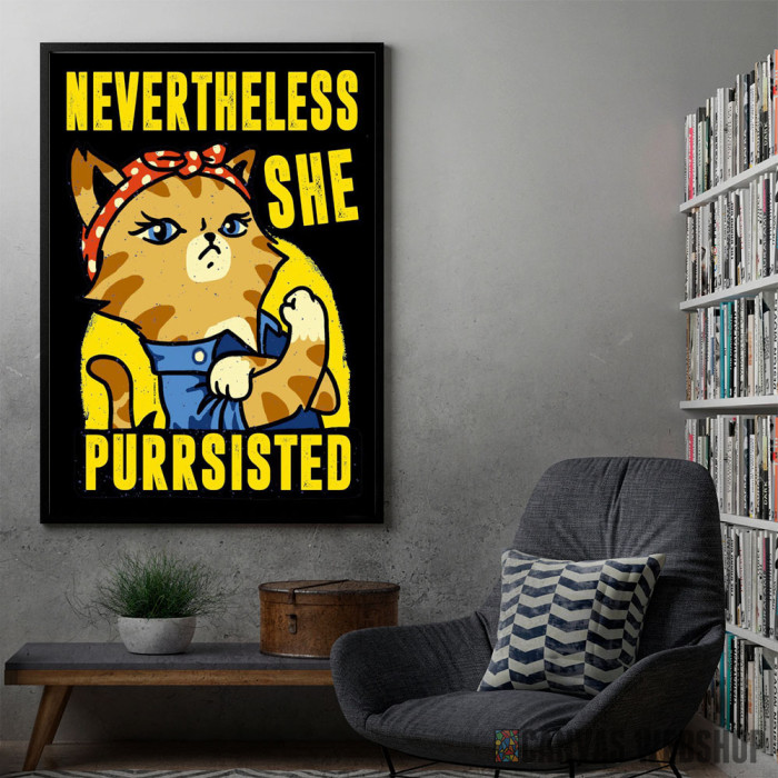 Cat She Purrsisted je poster odštampan na papiru koji uokviruje elegantan drveni ram sa staklom. Uramljeni poster je dostupan u različitim dimenzijama.