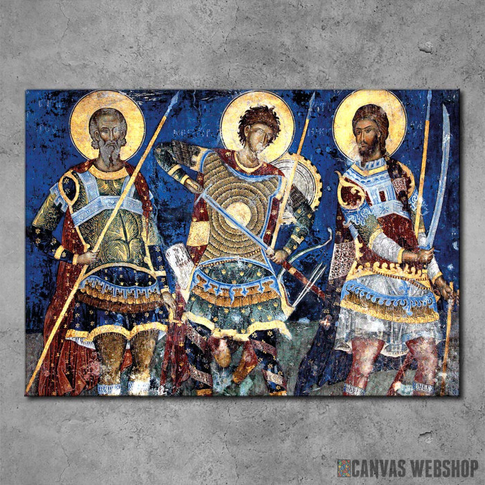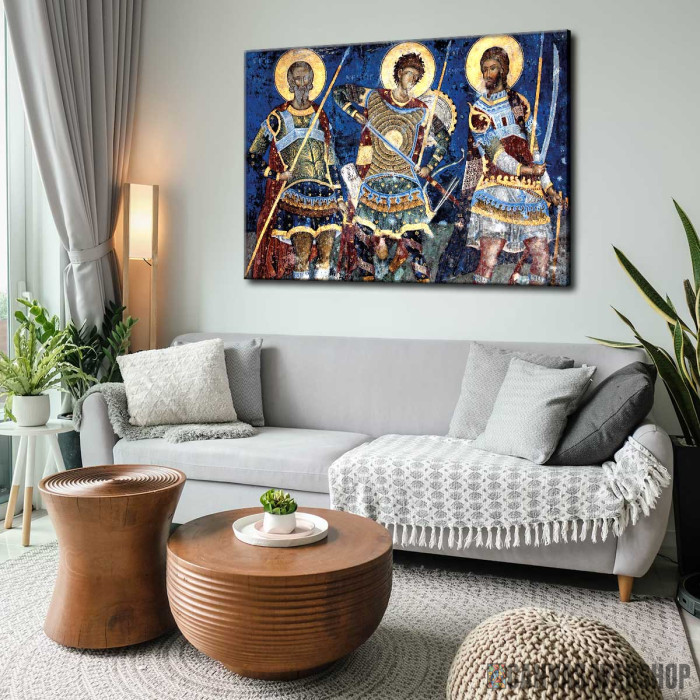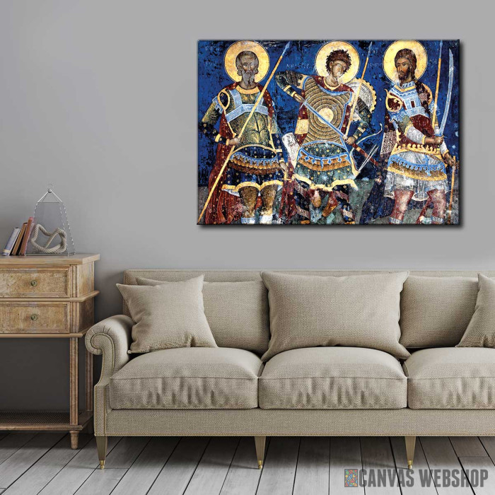 Reprodukcija freske Sveti Ratnici iz manastira Manasija je slika odštampana na kvalitetnom pamučnom platnu koje je zategnuto na ram od bukovog drveta. Slika je dostupna u različitim dimenzijama.