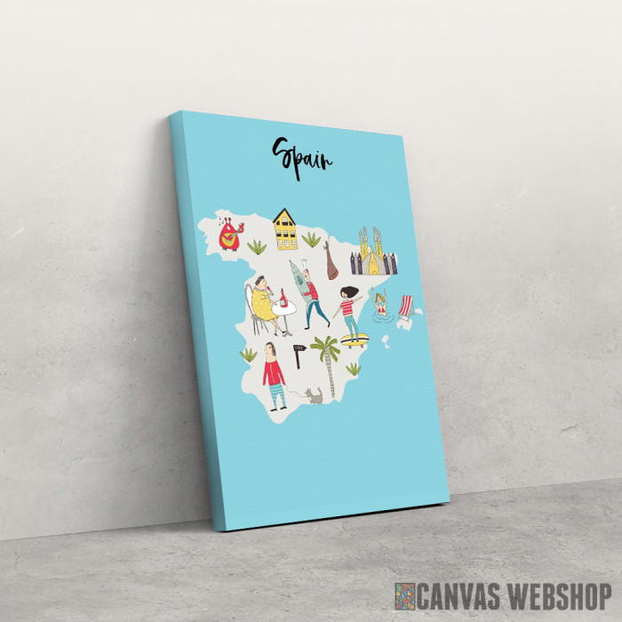 Ilustrovana mapa Španije je slika odštampana na kvalitetnom pamučnom platnu koje je zategnuto na ram od bukovog drveta. Slika Ilustrovana mapa Španije je dostupna u različitim dimenzijama.