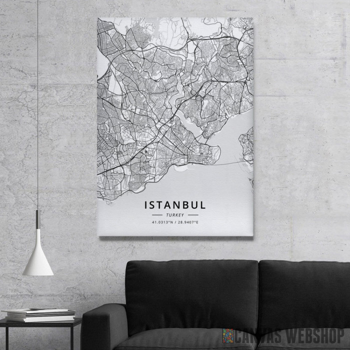 Istanbul mapa - white je slika odštampana na kvalitetnom pamučnom platnu koje je zategnuto na ram od bukovog drveta. Slika Istanbul mapa - white je dostupna u različitim dimenzijama.