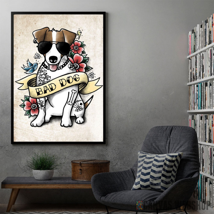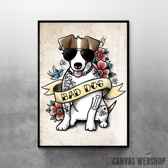jack russell terrier bad dog tattoo je poster odštampan na papiru koji uokviruje elegantan drveni ram sa staklom. Uramljeni poster je dostupan u različitim dimenzijama.