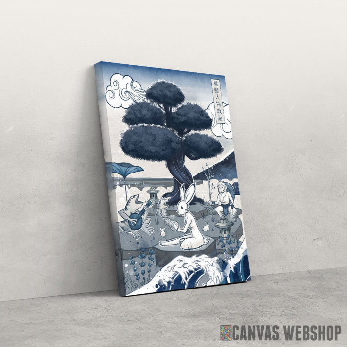 Japan Blue Choju giga je slika odštampana na kvalitetnom pamučnom platnu koje je zategnuto na ram od bukovog drveta. Slika Japan Blue Choju giga je dostupna u različitim dimenzijama.