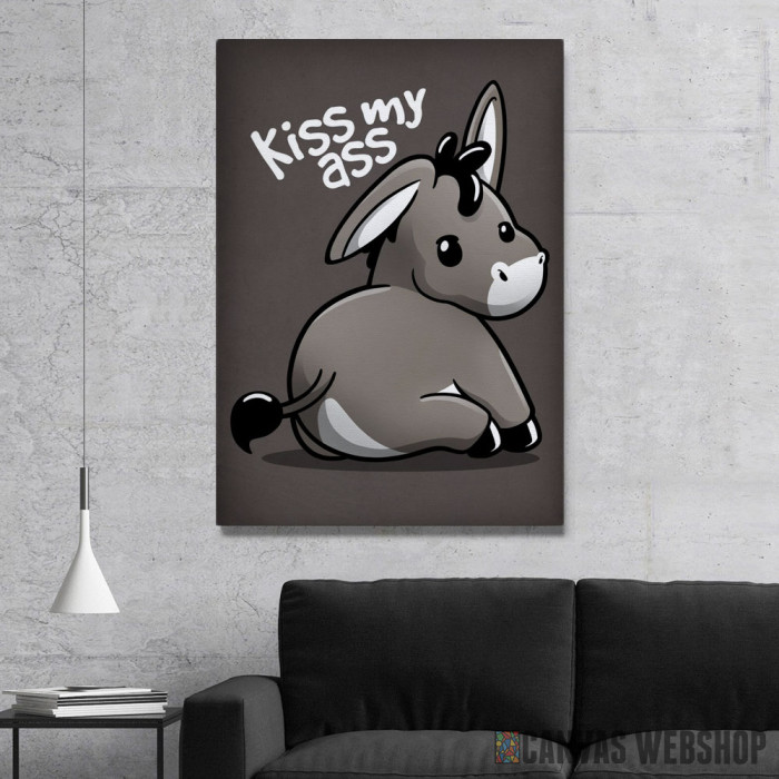 kiss my ass donkey je slika odštampana na kvalitetnom pamučnom platnu koje je zategnuto na ram od bukovog drveta. Slika kiss my ass donkey je dostupna u različitim dimenzijama.