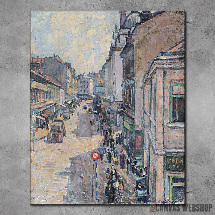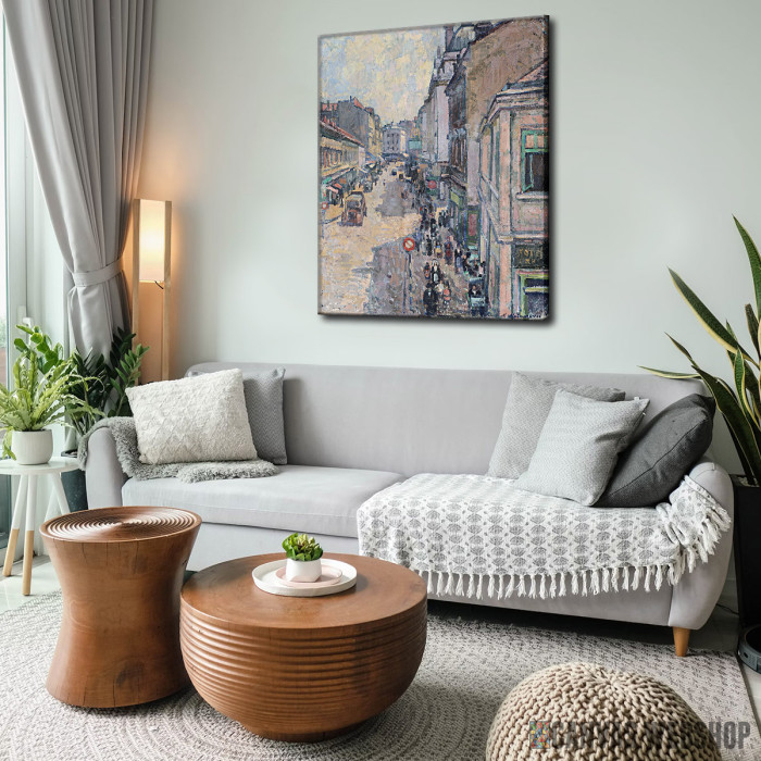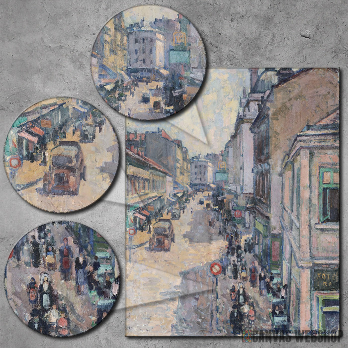 Knez Mihailova ulica je reprodukcija odštampana na kvalitetnom pamučnom platnu koje je zategnuto na ram od bukovog drveta. Slika je dostupna u različitim dimenzijama.