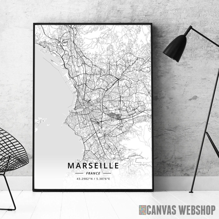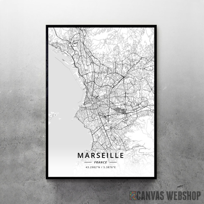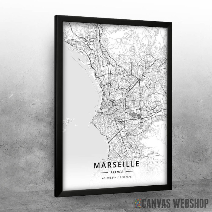 Marselj mapa - white je poster odštampan na papiru koji uokviruje elegantan drveni ram sa staklom. Uramljeni poster je dostupan u različitim dimenzijama.