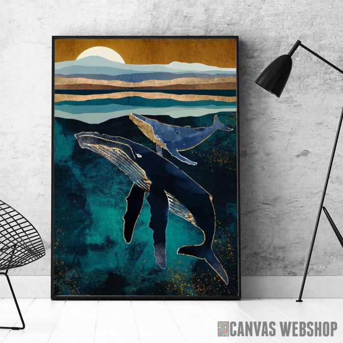 Moonlit Whales je poster odštampan na papiru koji uokviruje elegantan drveni ram sa staklom. Uramljeni poster je dostupan u različitim dimenzijama.
