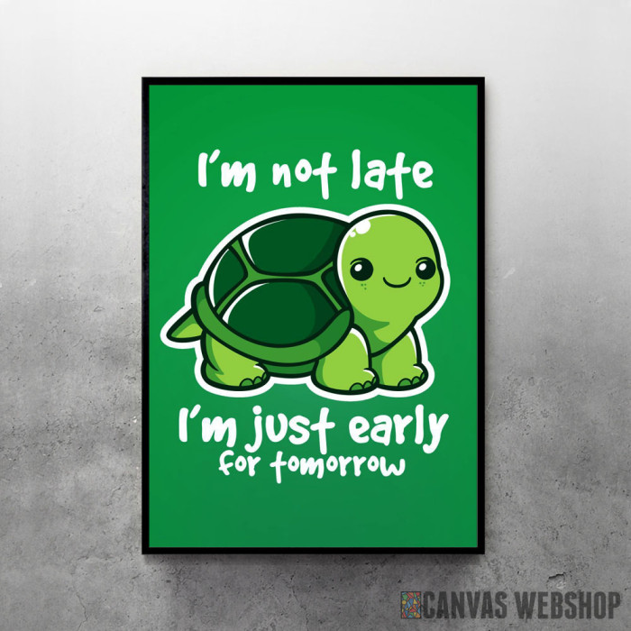 Never late turtle je poster odštampan na papiru koji uokviruje elegantan drveni ram sa staklom. Uramljeni poster je dostupan u različitim dimenzijama.
