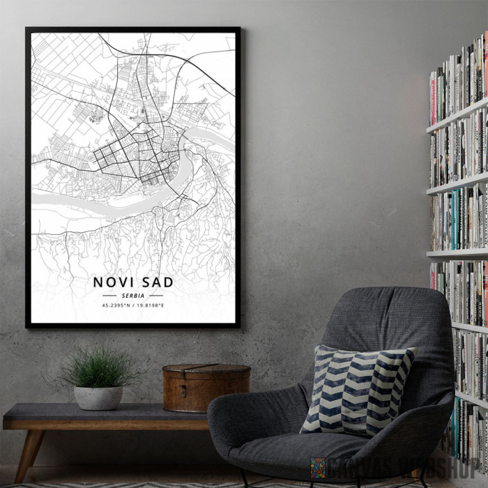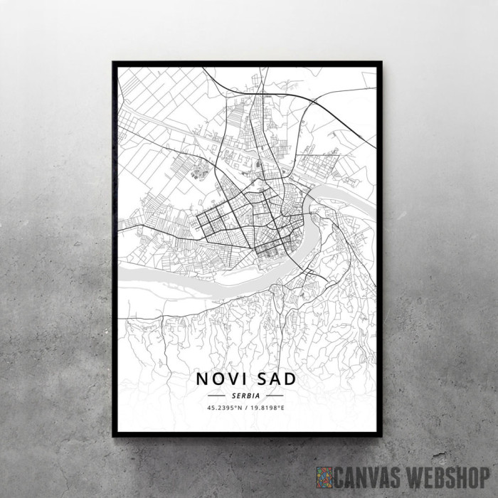 Novi Sad mapa - white je poster odštampan na papiru koji uokviruje elegantan drveni ram sa staklom. Uramljeni poster je dostupan u različitim dimenzijama.