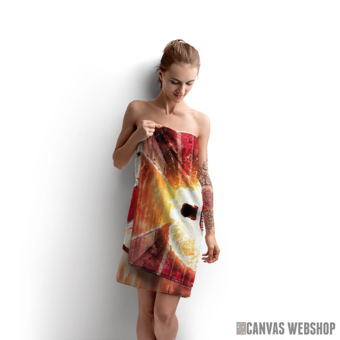 Materijal 60% pamuk (frotir 400g/m2) i 40% poliester (mikrofiber). Štampa je sa prednje strane, odnosno na mikrofiberu, celom površinom. Tehnika štampe je digitalna sublimacija bojama na vodenoj bazi. Urađen je porub po obodu.