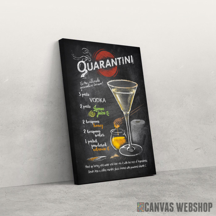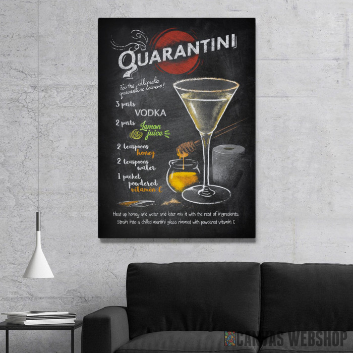 Quarantini je slika odštampana na kvalitetnom pamučnom platnu koje je zategnuto na ram od bukovog drveta. Slika Quarantini je dostupna u različitim dimenzijama.