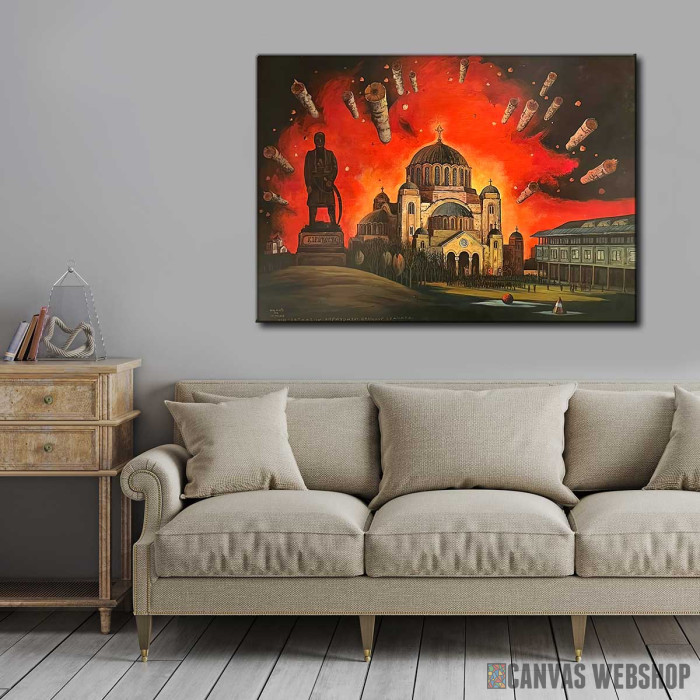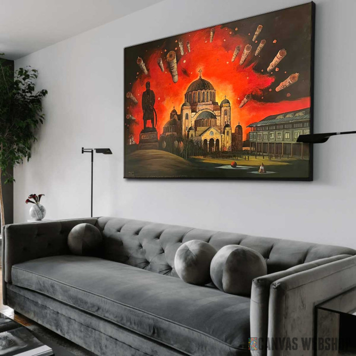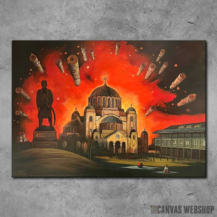 Zapaljeni horizonti velikog Vračara je slika odštampana na kvalitetnom pamučnom platnu koje je zategnuto na ram od bukovog drveta. Slika je dostupna u različitim dimenzijama.