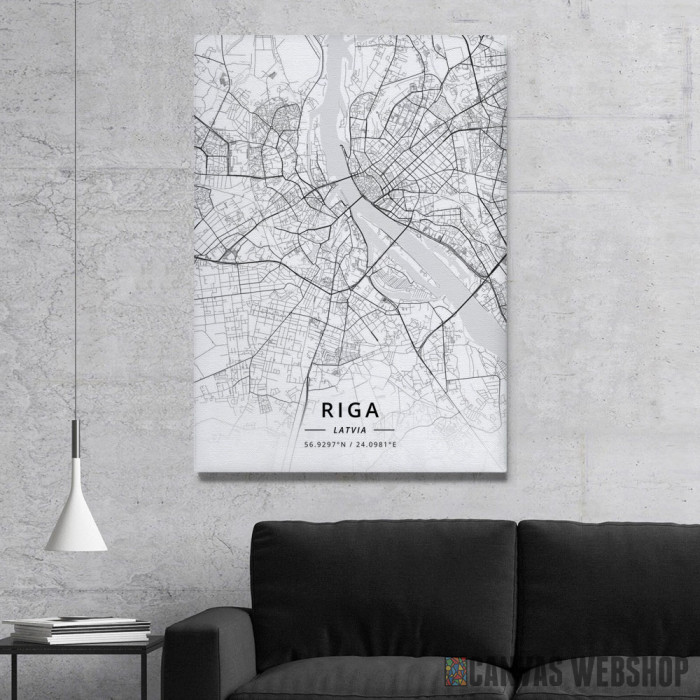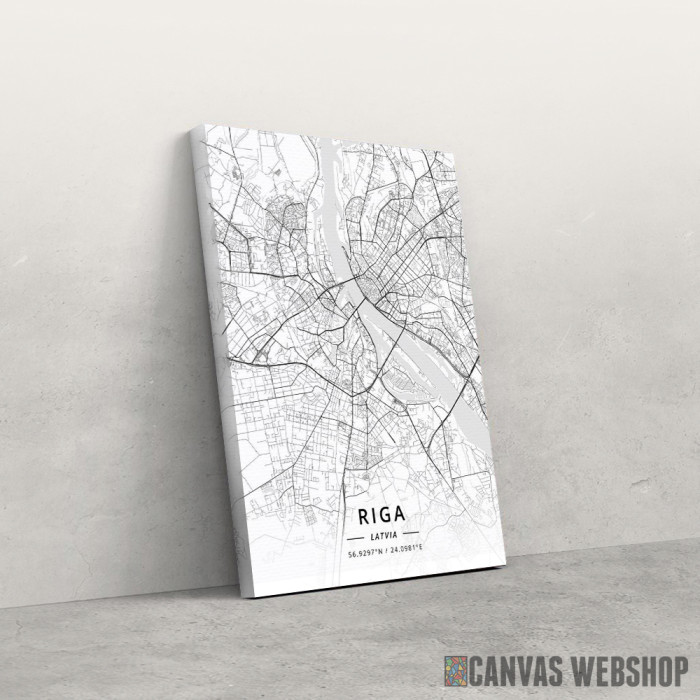 Riga mapa - white je slika odštampana na kvalitetnom pamučnom platnu koje je zategnuto na ram od bukovog drveta. Slika Riga mapa - white je dostupna u različitim dimenzijama.