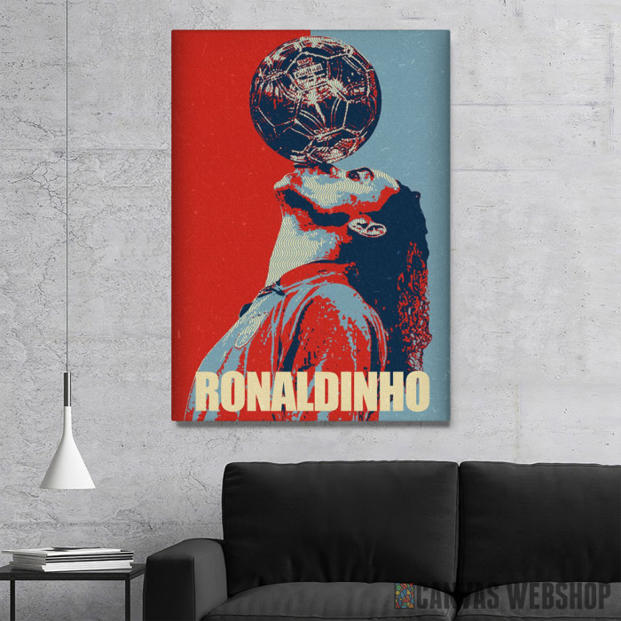 Ronaldinjo i lopta je slika odštampana na kvalitetnom pamučnom platnu koje je zategnuto na ram od bukovog drveta. Slika Ronaldinjo i lopta je dostupna u različitim dimenzijama.