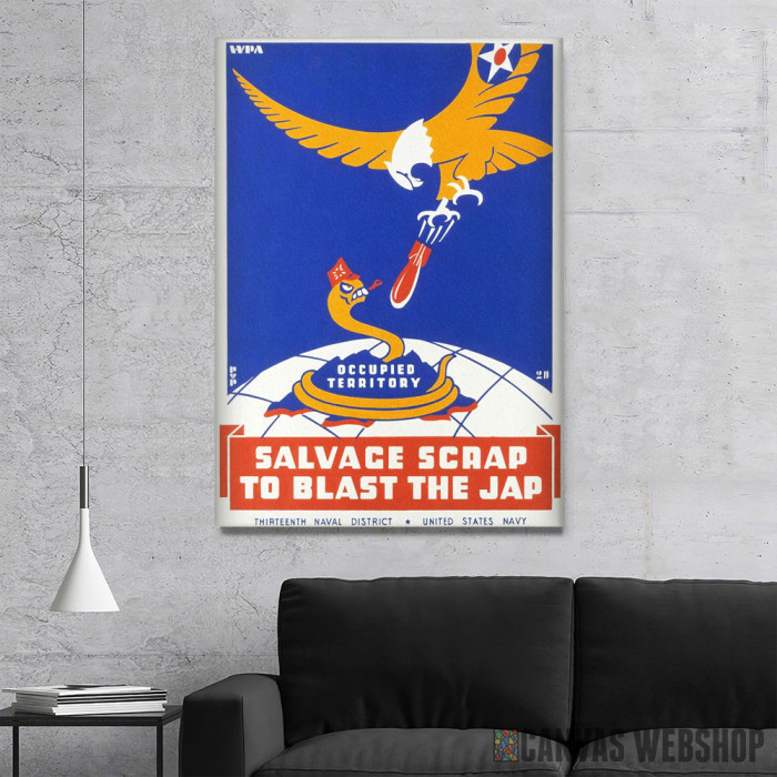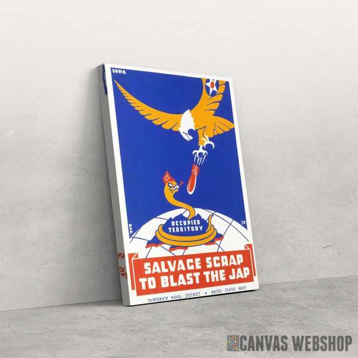 Salvage Scrap to blast the Jap je slika odštampana na kvalitetnom pamučnom platnu koje je zategnuto na ram od bukovog drveta. Slika Salvage Scrap to blast the Jap je dostupna u različitim dimenzijama.