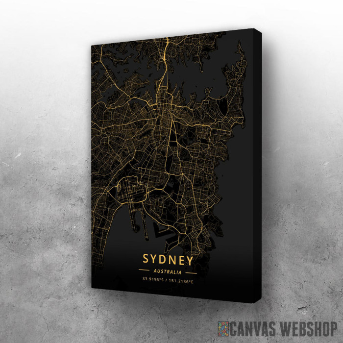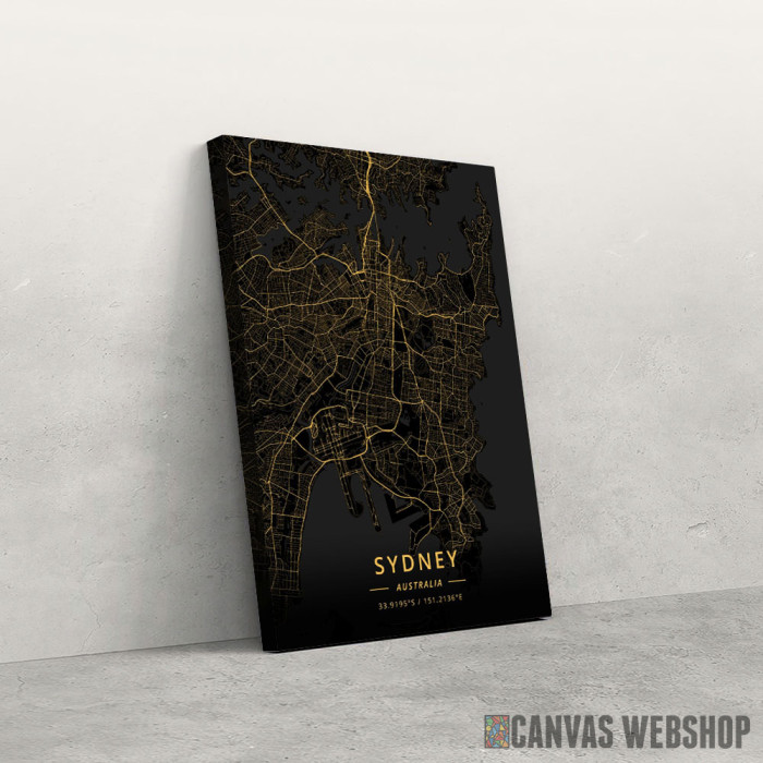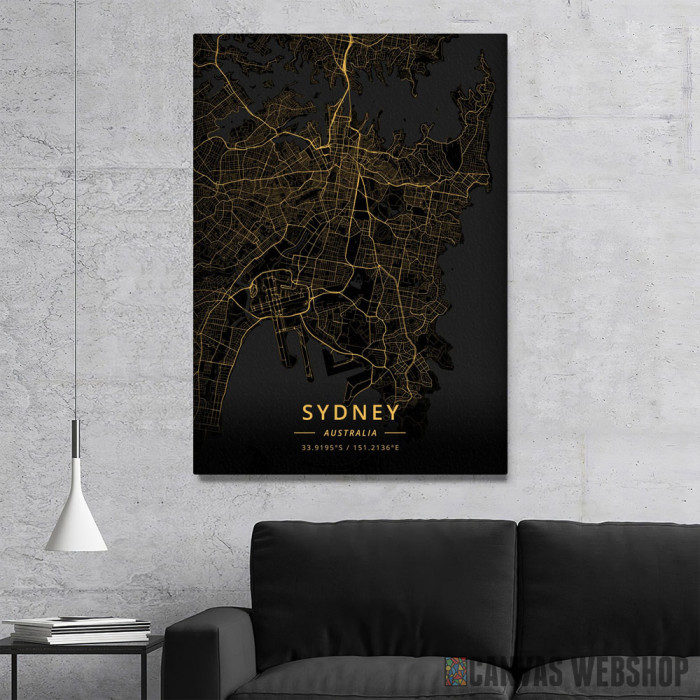 Sidnej mapa - crno zlatno je slika odštampana na kvalitetnom pamučnom platnu koje je zategnuto na ram od bukovog drveta. Slika Sidnej mapa - crno zlatno je dostupna u različitim dimenzijama.