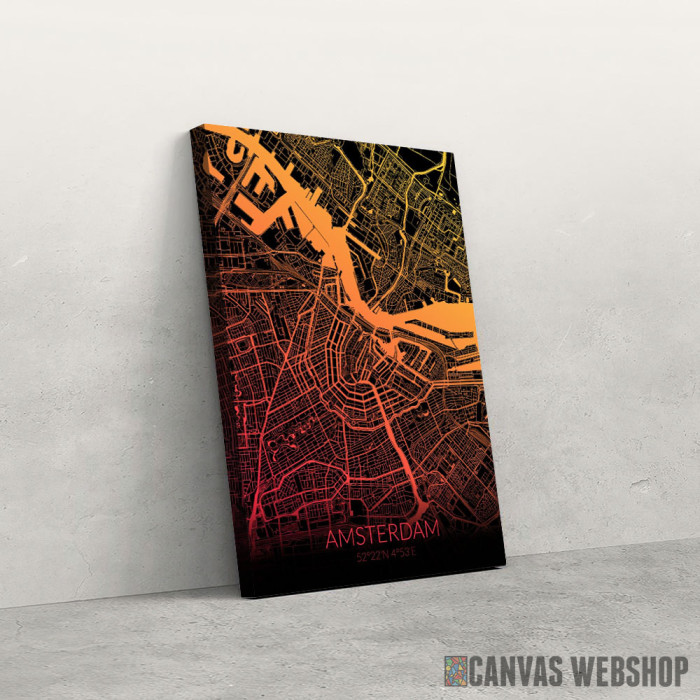 Amsterdam mapa - black and orange je slika odštampana na kvalitetnom pamučnom platnu koje je zategnuto na ram od bukovog drveta. Slika Amsterdam mapa - black and orange je dostupna u različitim dimenzijama.