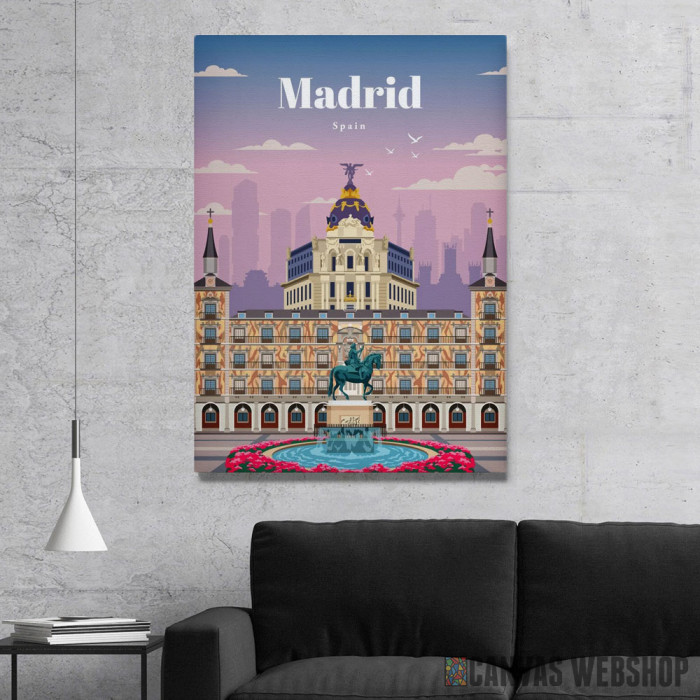 Travel to Madrid je slika odštampana na kvalitetnom pamučnom platnu koje je zategnuto na ram od bukovog drveta. Slika Travel to Madrid je dostupna u različitim dimenzijama.