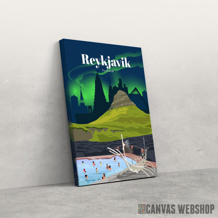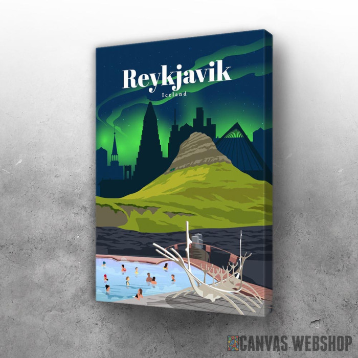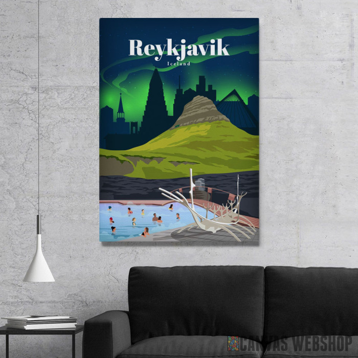 Travel to Rejkjavik je slika odštampana na kvalitetnom pamučnom platnu koje je zategnuto na ram od bukovog drveta. Slika Travel to Rejkjavik je dostupna u različitim dimenzijama.