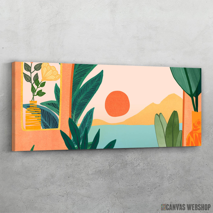 Tropsko vece je slika odštampana na kvalitetnom pamučnom platnu koje je zategnuto na ram od bukovog drveta. Slika Tropsko vece je dostupna u različitim dimenzijama.