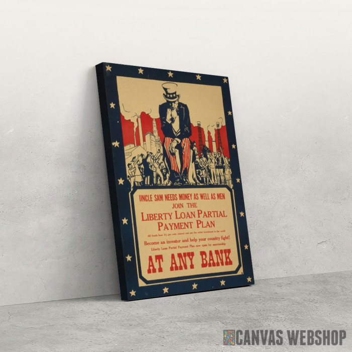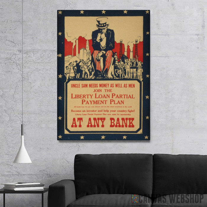 Uncle Sam needs money je slika odštampana na kvalitetnom pamučnom platnu koje je zategnuto na ram od bukovog drveta. Slika Uncle Sam needs money je dostupna u različitim dimenzijama.
