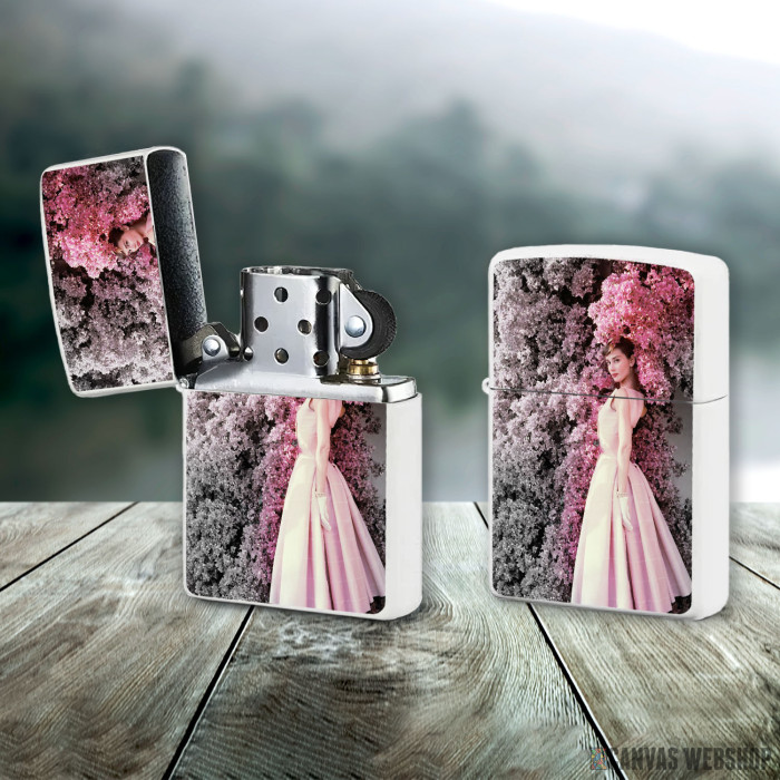 Metalni vetrootporni upaljač sa slikom Audrey Hepburn with flower kao dobar poklon ili vaš pratilac za sve prilike!