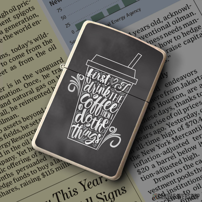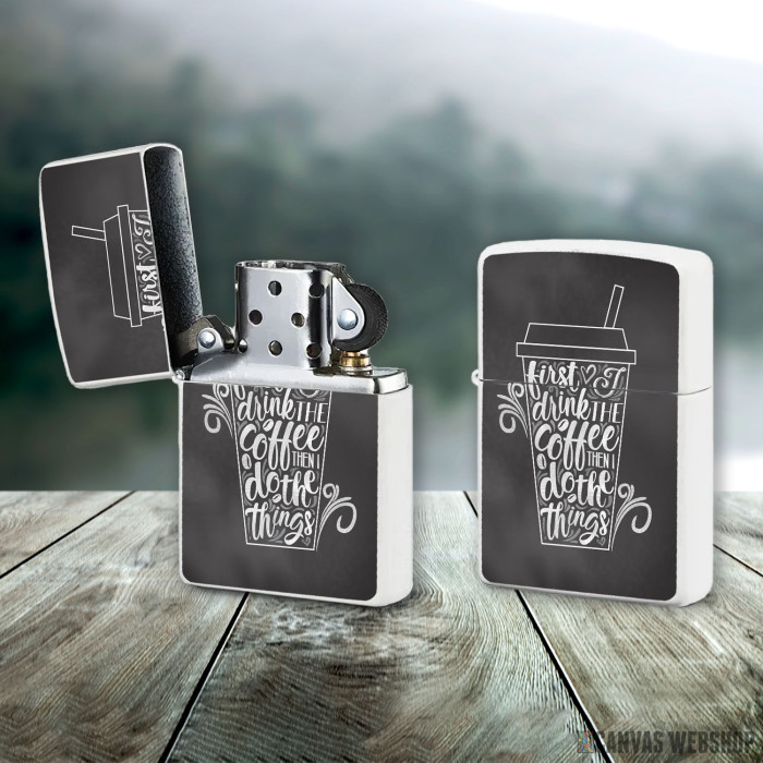Metalni vetrootporni upaljač sa slikom First I Drink My Coffee kao dobar poklon ili vaš pratilac za sve prilike!