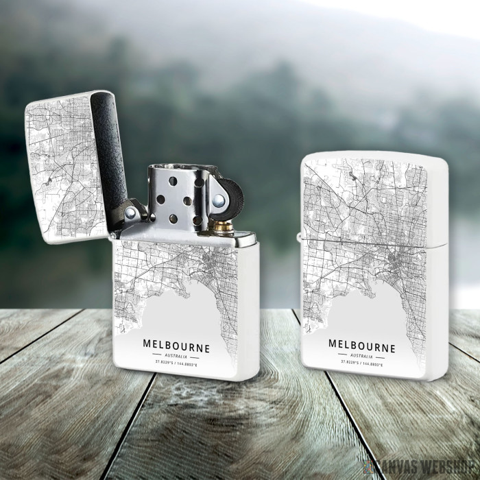 Metalni vetrootporni upaljač sa slikom Melburn mapa - white kao dobar poklon ili vaš pratilac za sve prilike!