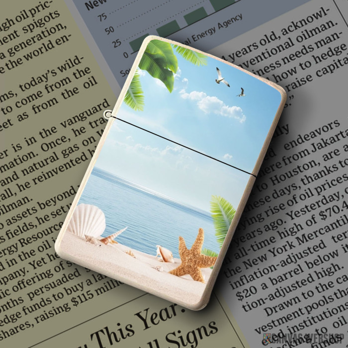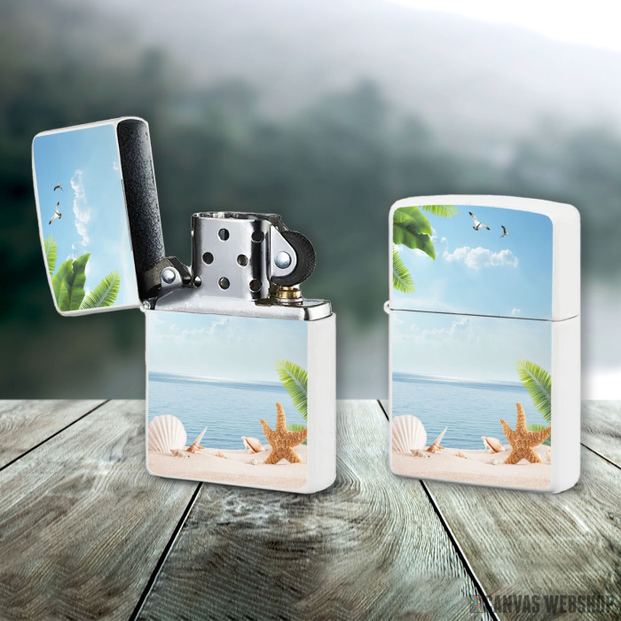 Metalni vetrootporni upaljač sa slikom Palm Beach With Seashells kao dobar poklon ili vaš pratilac za sve prilike!