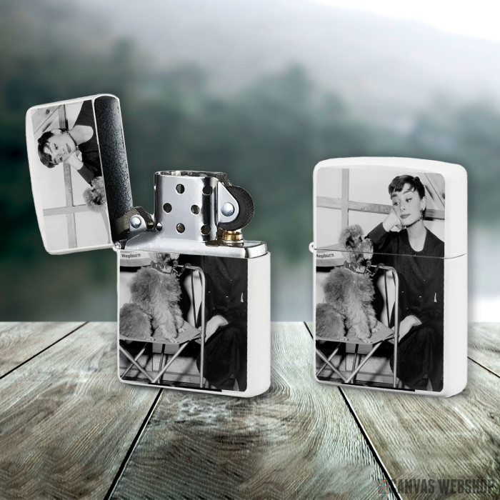 Metalni vetrootporni upaljač sa slikom Audrey Hepburn With a Dog kao dobar poklon ili vaš pratilac za sve prilike!