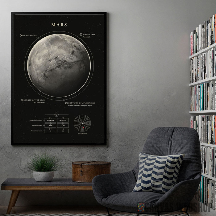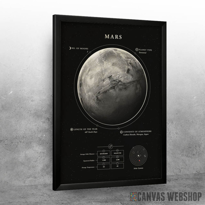 Mars je poster odštampan na papiru koji uokviruje elegantan drveni ram sa staklom. Uramljeni poster je dostupan u različitim dimenzijama.