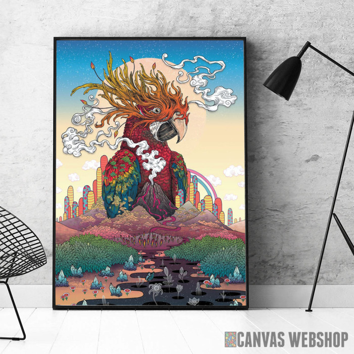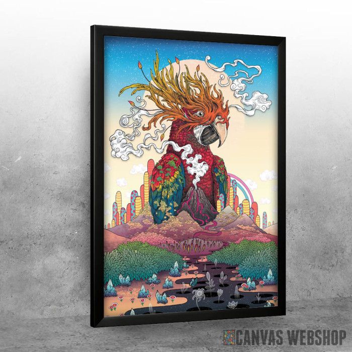 Nadrealni papagaj je poster odštampan na papiru koji uokviruje elegantan drveni ram sa staklom. Uramljeni poster je dostupan u različitim dimenzijama.