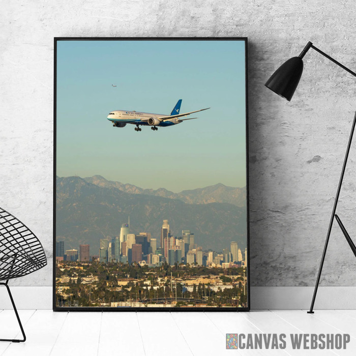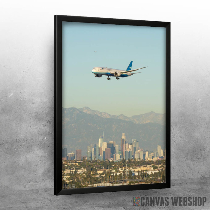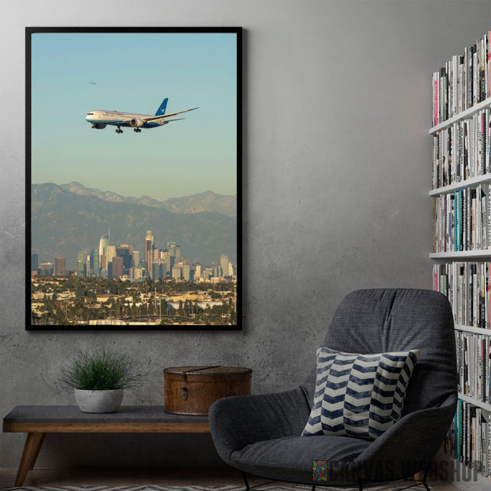 Plane Over The City je poster odštampan na papiru koji uokviruje elegantan drveni ram sa staklom. Uramljeni poster je dostupan u različitim dimenzijama.