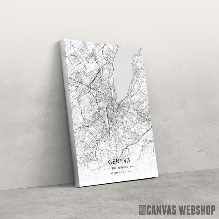 Ženeva mapa - white je slika odštampana na kvalitetnom pamučnom platnu koje je zategnuto na ram od bukovog drveta. Slika Ženeva mapa - white je dostupna u različitim dimenzijama.