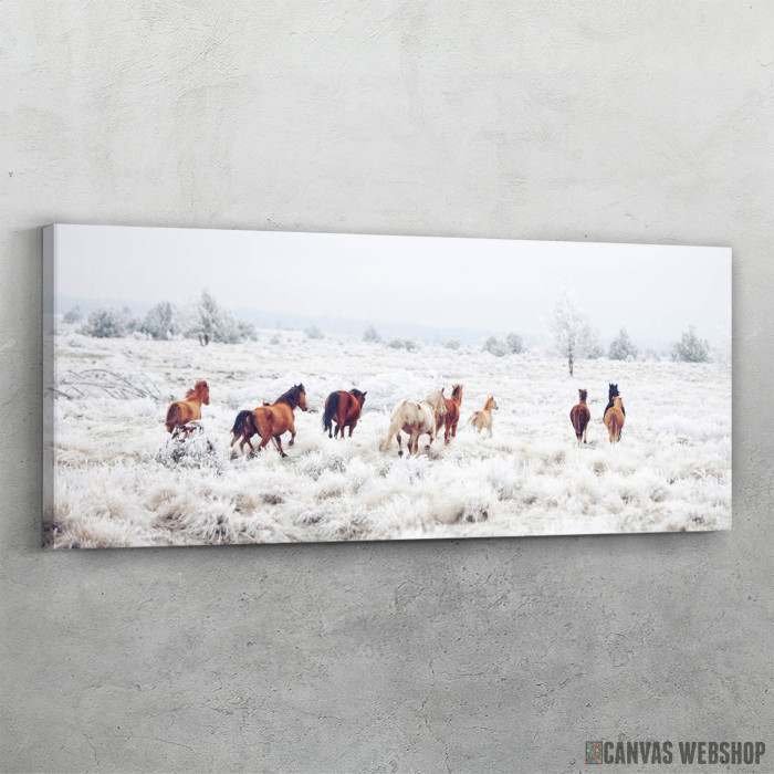 Zimski konji je slika odštampana na kvalitetnom pamučnom platnu koje je zategnuto na ram od bukovog drveta. Slika Zimski konji je dostupna u različitim dimenzijama.